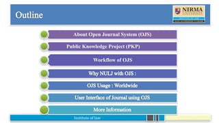 Open Journal System (OJS) is an open-source journal management and publishing system developed by the Public Knowledge Project (PKP) that supports online submission, peer review workflows, and open access publishing. OJS facilitates the entire refereed publishing process and is used by over 6,500 journals worldwide. The PKP is a multi-university partnership dedicated to developing open technologies to improve the reach and value of scholarly research.