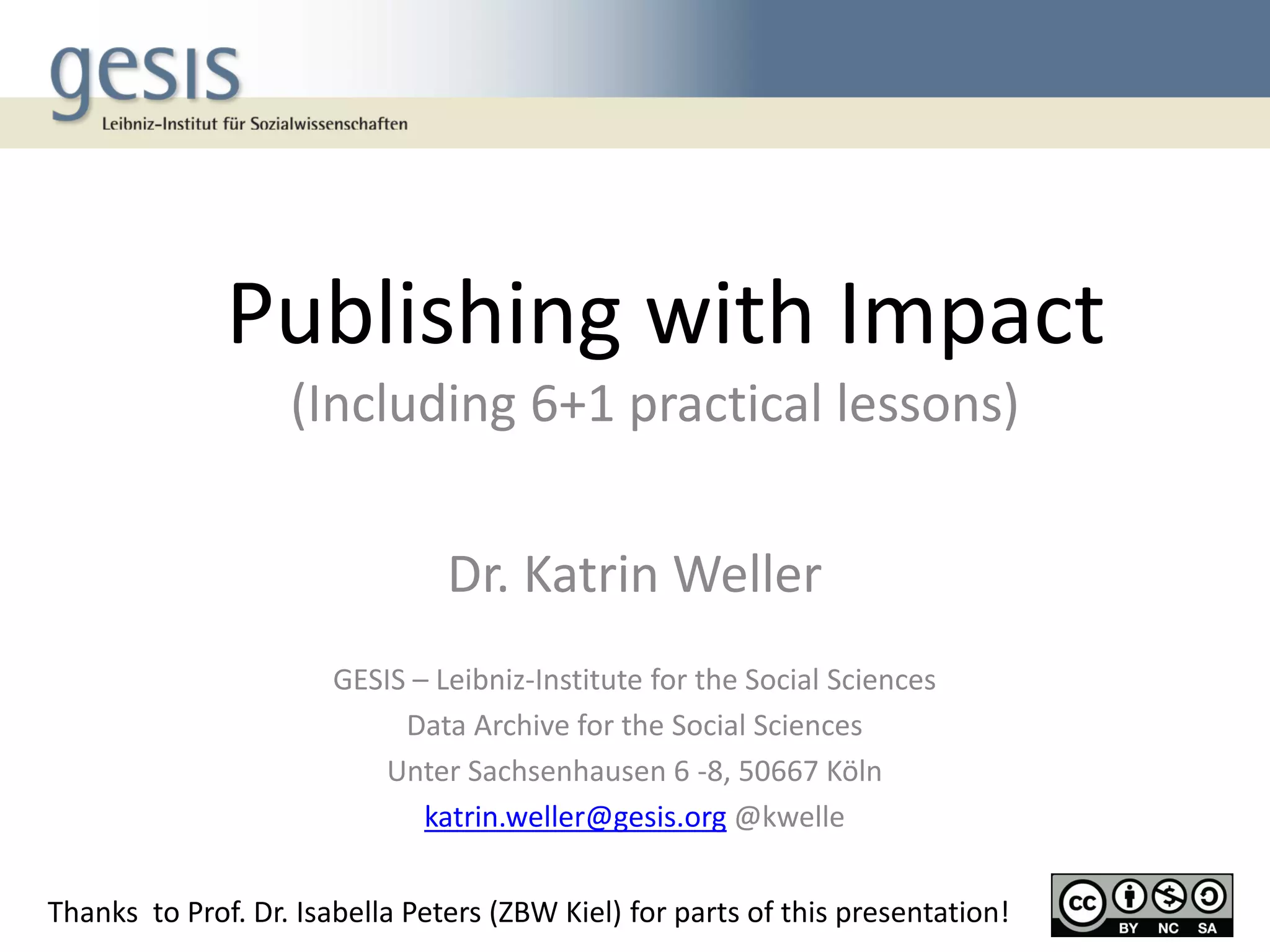 This document provides 6+1 practical lessons for publishing with impact. It discusses how impact is important for career advancement and obtaining grants and opportunities. Key metrics for impact are journal impact factors and h-index. The lessons recommend knowing top journals in your field, balancing activities across different venues, making work openly accessible, maintaining profiles on platforms like Google Scholar and Scopus, experimenting with alternative platforms, and maintaining enthusiasm for your work. Bibliometric databases, open access, and self-archiving can increase citations and impact. Manual checks are needed because automatic systems can include errors.