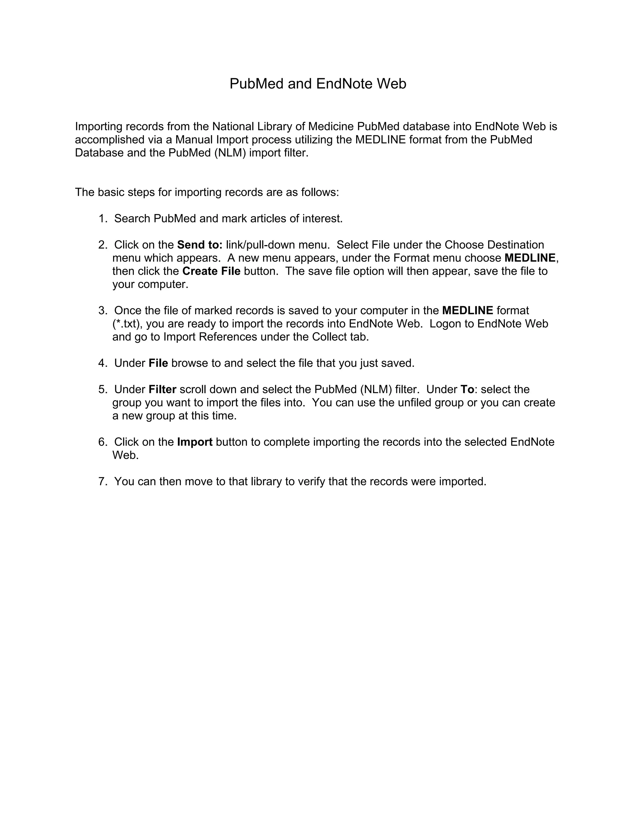 The document outlines the steps for importing records from the PubMed database into EndNote Web using a manual process with the Medline format. It details actions such as marking articles in PubMed, saving them to a file, and then utilizing EndNote Web to import the records by selecting the appropriate filter and group. After importing, users can verify the records in their EndNote library.