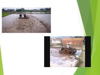 Puddling involves saturating soil and breaking up aggregates through plowing and harrowing when the soil is flooded or saturated. This process is important for rice cultivation as it controls weeds, conserves water, and makes transplanting easier. However, puddling also destroys the soil structure, reduces pore space, increases compaction, and can lead to issues like waterlogging over the long term. Puddling decreases hydraulic conductivity and permeability while increasing bulk density, moisture retention, and causing changes to the soil thermal properties. Overall, puddling improves conditions for rice growth but degrades the soil physical properties.