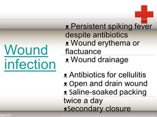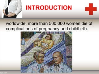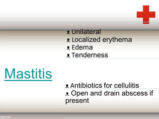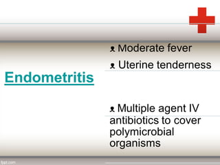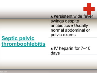 This document discusses puerperal pyrexia, which is a temperature of 100.4°F or higher within the first 10 days following delivery. It defines puerperal pyrexia and notes its historical prevalence. The causes are listed for different time periods postpartum, including atelectasis, urinary tract infections, endometritis, wound infections, and mastitis. Puerperal sepsis is also defined as an infection of the genital tract occurring after delivery. Risk factors and causes are provided. Signs and symptoms, investigations, prophylaxis, treatment including isolation, antibiotics, and potential surgical interventions are summarized.