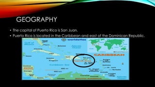 Puerto Rico is a self-governing commonwealth associated with the United States located in the Caribbean east of the Dominican Republic. San Juan is the capital and largest city, founded in 1521. Other major cities include Bayamón and Ponce. Popular tourist attractions include El Yunque National Rainforest and Arecibo Observatory. Puerto Rican culture features music styles like bomba, plena and salsa. Traditional foods include arroz con gandules and coconut desserts. Influential Puerto Ricans include Pedro Albizu Campos, José Celso Barbosa and Federico Degetau.