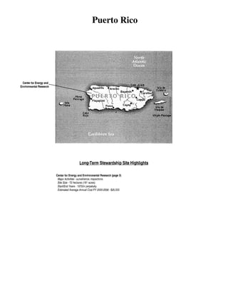 The Center for Energy and Environmental Research (CEER) in Puerto Rico consists of four sites totaling 72 hectares that were used for nuclear and energy research. DOE has completed cleanup activities at the sites according to environmental regulations. Long-term stewardship responsibilities remain for the Boiling Nuclear Superheat Research Reactor site, which includes annual inspections and maintenance of security and controls around the entombed radioactive materials. The estimated annual cost for long-term stewardship is $25,000.