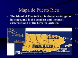 Puerto Rico is the smallest and easternmost island of the Greater Antilles. The coquí frog is Puerto Rico's national mascot and sings at night. El Yunque National Forest is the only tropical rainforest in the US National Forest System, containing over 240 plant and tree species. San Juan is the capital and oldest city, founded in 1521 with a large natural harbor. Salsa music originated from Puerto Rican communities in New York and blends Cuban and African influences. Bomba and plena are distinct musical traditions, with bomba being of pure African origin and plena blending Taíno and other cultural elements.