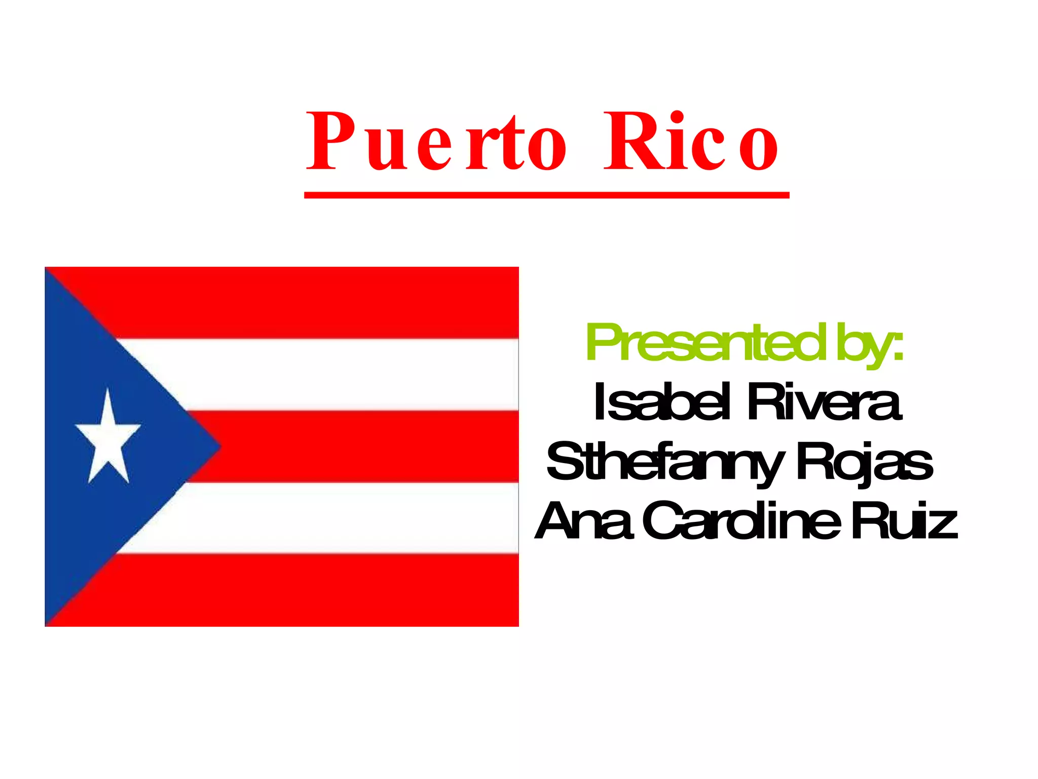 Puerto Rico was originally inhabited by native Arawak people. It was discovered by Christopher Columbus in the 15th century and became a Spanish colony. Puerto Rico is now a self-governing commonwealth of the United States. There are three main political parties that have different views on Puerto Rico's relationship to the U.S.: those who want independence, statehood, or the current commonwealth status. Puerto Rico has a tropical climate and was largely deforested. The economy relies on tourism and industries like pharmaceuticals. Spanish is the main language and the dollar is the official currency.