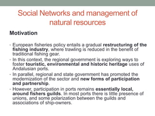 The document explores the social networks of fishermen and skippers in Andalusian fishing ports, highlighting the effects of European fisheries policy and local participation structures. It identifies two main fishing grounds, the Atlantic and the Mediterranean, and discusses different sociability patterns associated with professional roles and relationships within these networks. The conclusions emphasize the need for traditional fishing guilds in navigating the tensions between regional policies and EU fisheries regulations.