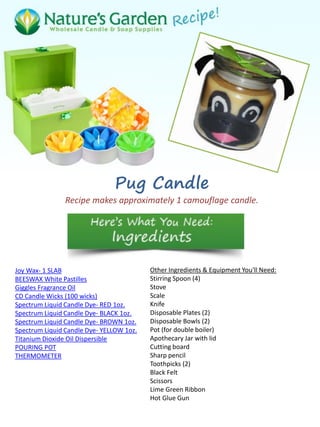 This document provides a detailed recipe for making a camouflage pug candle using various ingredients like beeswax, fragrance oil, and candle dyes. It outlines step-by-step instructions including melting wax, combining colors, designing the pug's face, and assembling the candle. The final steps include securing the lid with decorative elements before the candle is ready for use.