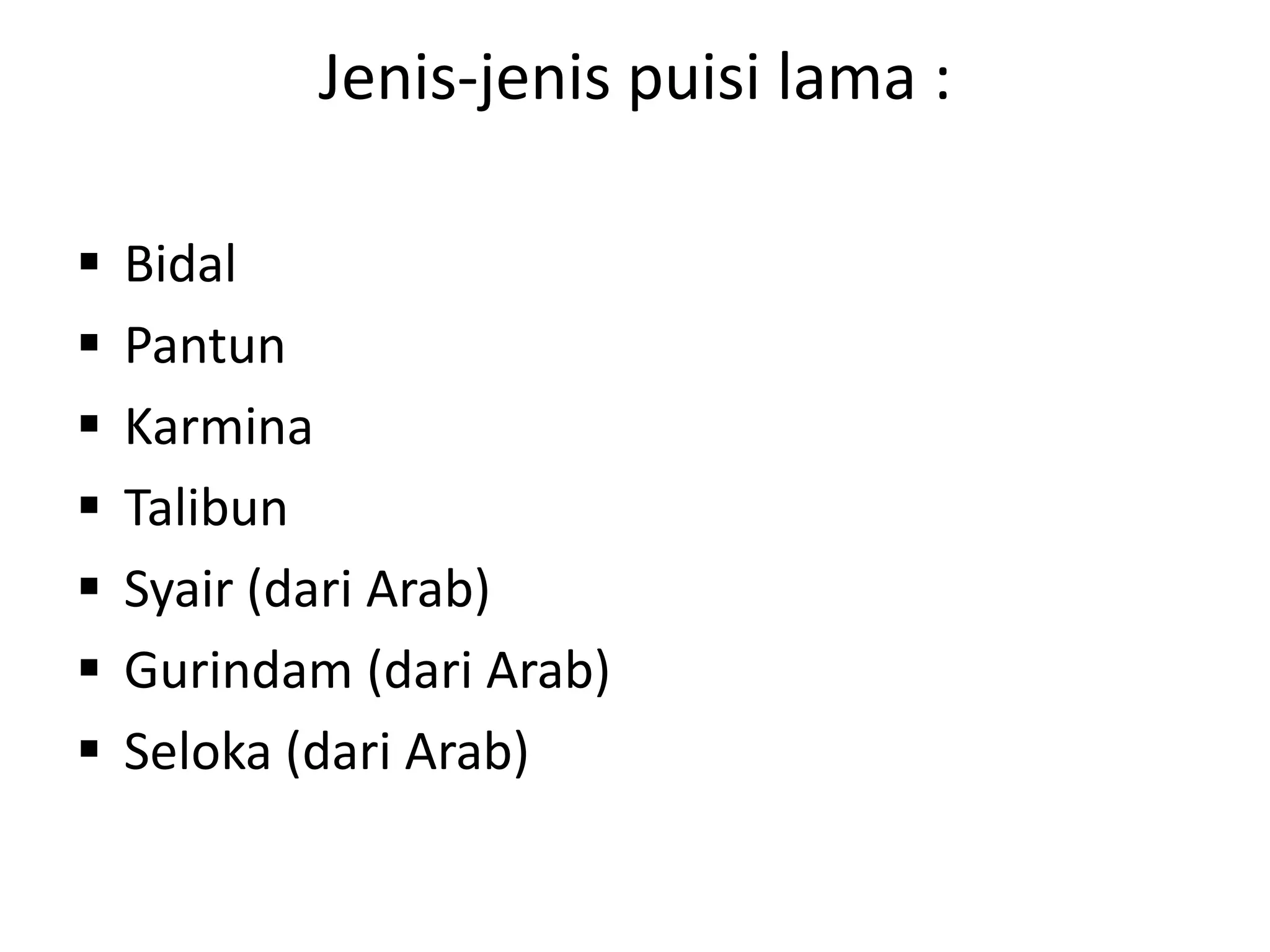 Dokumen tersebut membahas beberapa jenis puisi lama dari Indonesia seperti syair dan pantun. Syair terdiri atas 4 baris dengan pola rima a-a-a-a, sedangkan pantun terdiri atas 4 baris dengan pola rima a-b-a-b dan baris 1-2 berisi sampiran sedangkan baris 3-4 berisi inti pantun.