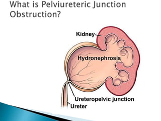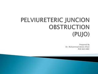 PUJO is an obstruction of the proximal ureter at the junction with the renal pelvis. It is most common in childhood, affecting 1 in 1000 children, with boys more commonly affected than girls. Presentation includes flank pain, flank mass, nausea, vomiting, recurrent UTIs, and hematuria. Diagnosis involves blood tests, urine tests, ultrasounds, CT scans, nuclear scans, and retrograde pyelography. Treatment depends on symptoms and impairment - watchful waiting may be sufficient, but surgery like pyeloplasty is often needed and has a high success rate of 90-95%.