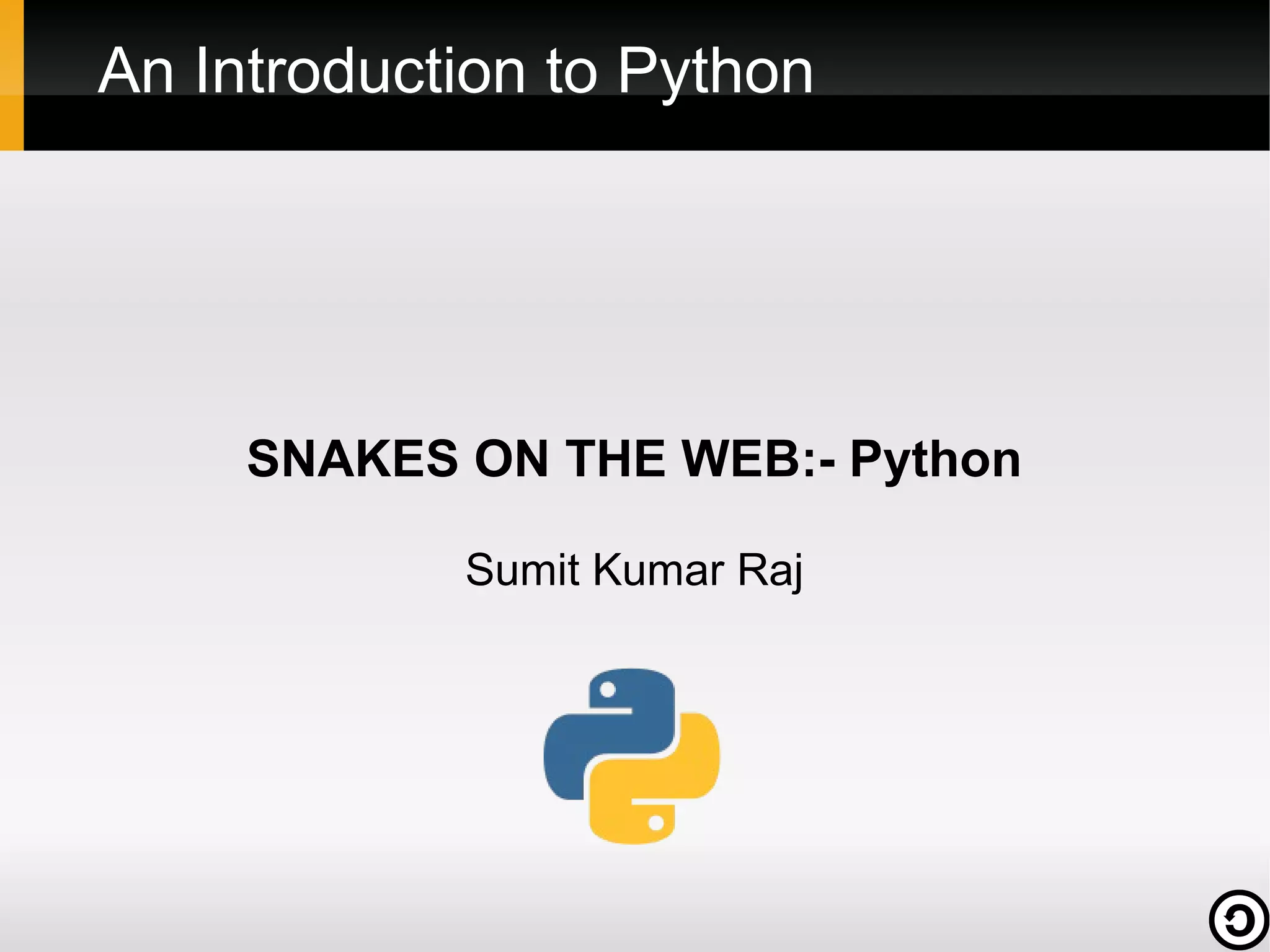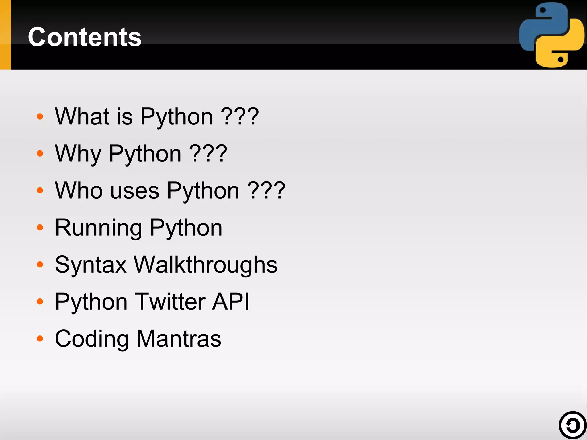 This document provides an introduction to the Python programming language. It discusses what Python is, its history and creator, why it is popular, who uses it, and how to get started with the syntax. Key topics covered include Python's readability, dynamic typing, standard library, and use across many industries. The document also includes code examples demonstrating basic Python concepts like variables, strings, control flow, functions, and file input/output.