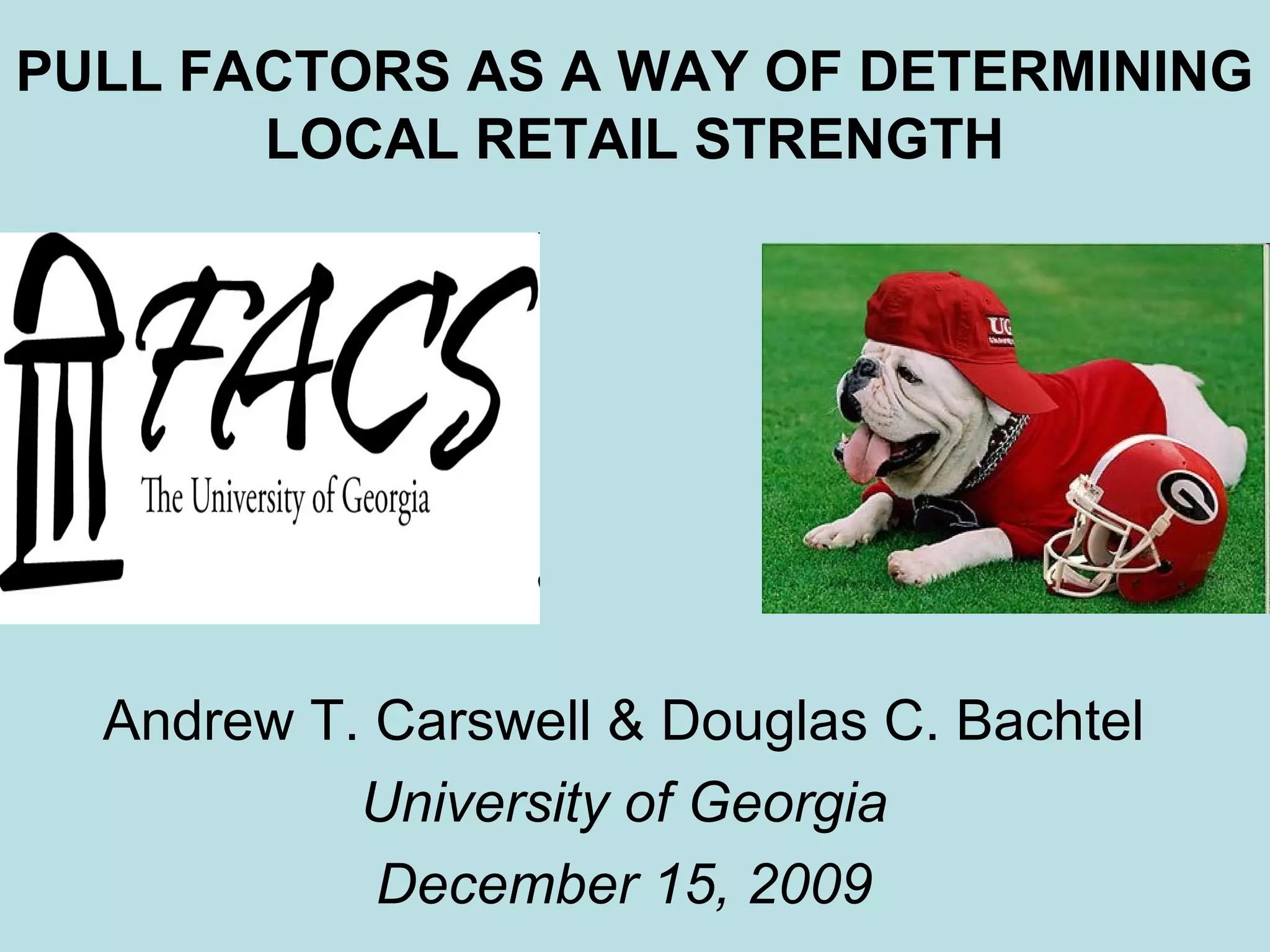 The document discusses pull factors as a measure of local retail strength in Georgia, calculating a county's retail buying power based on income and population effects. It defines pull factor, sales activity index, and wealth factor, providing a ranking of counties based on their retail strength. Key findings include variations in pull factors across different retail sectors for specific counties, highlighting strengths in food service, clothing, and home furnishings.