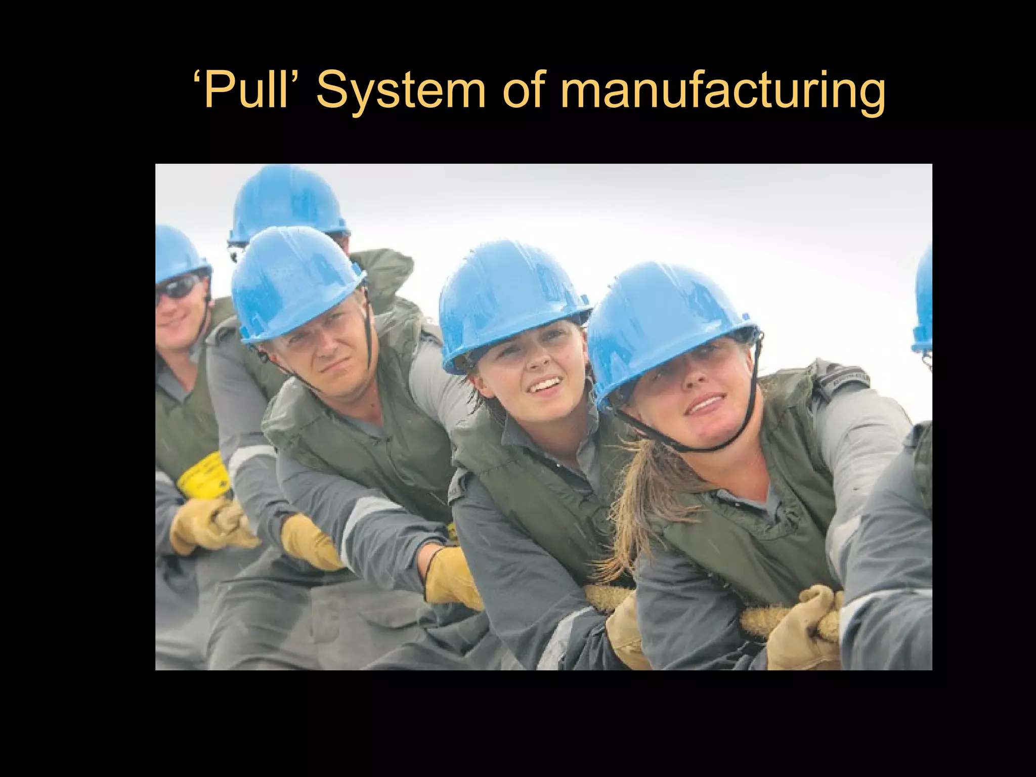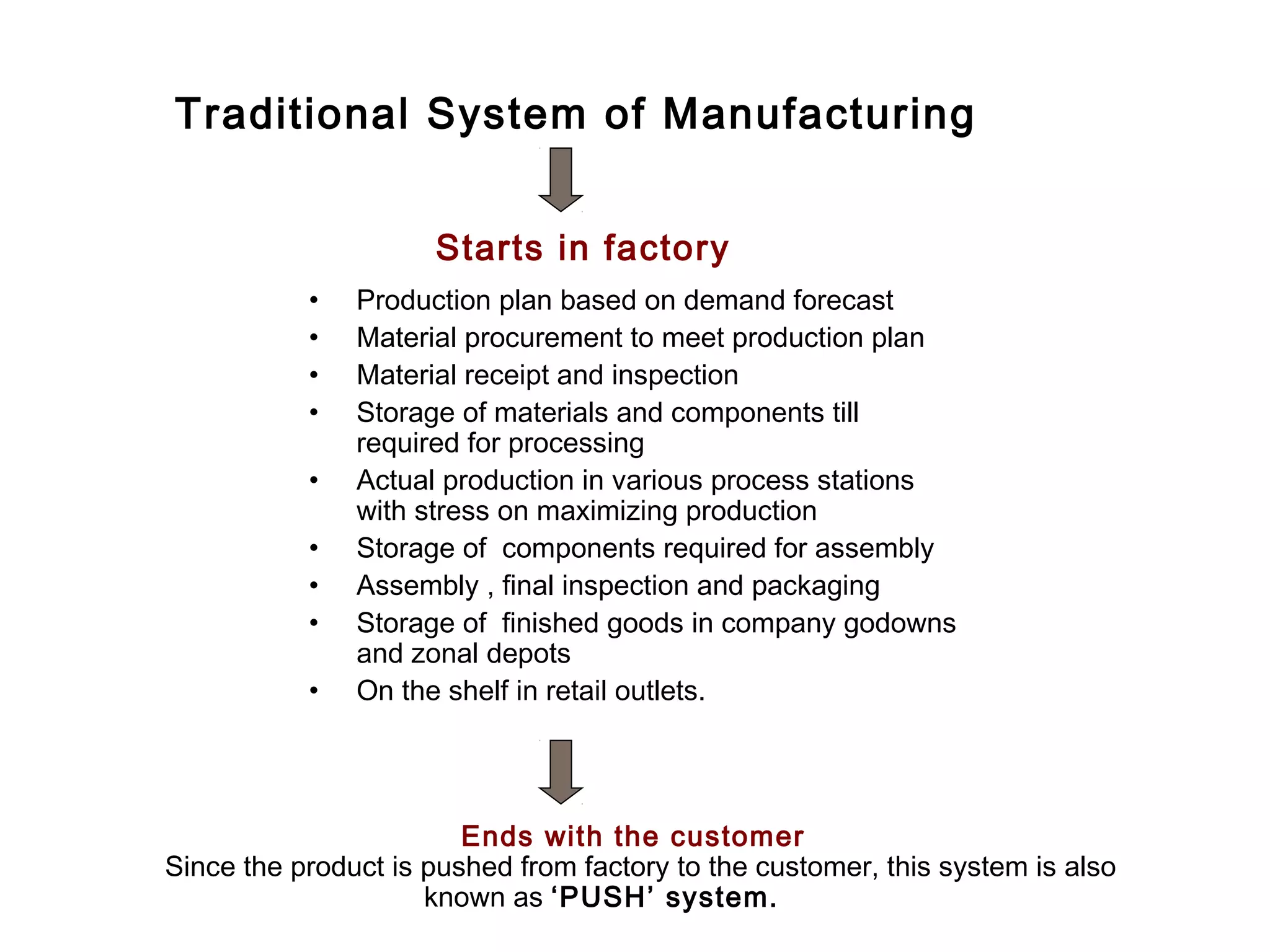 The document describes the traditional 'push' system of manufacturing and its weaknesses compared to the 'pull' system. The traditional system starts in the factory with production based on demand forecasts, involves storage of materials and components, and ends with finished goods in storage until purchased by customers. This pushes products from the factory to customers. In contrast, the 'pull' system starts with customer orders and uses a pull system of production down the process chain triggered by customer demand. The key principles of the 'pull' system emphasize minimizing waste and maximizing flow, utilization, flexibility, and communication.