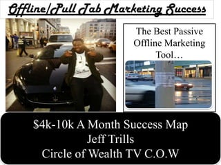 This document provides tips for using offline pull tab marketing to generate leads and sales. It recommends posting flyers in high-traffic areas like bus stops and train stations. The goal is to get 10% of viewers to respond by phone, and from those get 10% to sign up at the diamond level for $2000 per week. Specific actions include posting 600 flyers per week to get 60 calls and 6 signups. With weekly signups, the monthly goal of $4000 can be achieved along with bonuses. Key steps for phone calls include getting contact details and a callback commitment before sending more information.