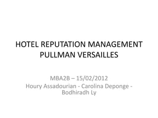 The Pullman Versailles hotel has received bad reviews on Tripadvisor about outdated rooms, air conditioning, and design. The general manager has not adequately addressed these complaints. To improve its reputation, the hotel should develop a customer service training program, renovate outdated rooms and air conditioning, respond faster to online reviews, launch a marketing campaign about renovations, and improve social media presence to build positive reputation.
