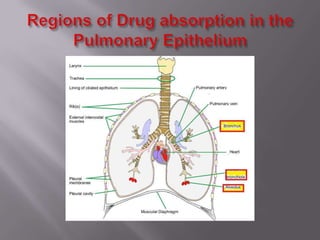 This document summarizes pulmonary drug delivery systems. It discusses the advantages of pulmonary delivery including rapid drug absorption and avoidance of first-pass metabolism. It also discusses disadvantages like difficulty using inhaler devices and mucociliary clearance reducing drug retention. Factors affecting particle distribution in the lungs like inspiratory flow rate and particle size are also covered. Finally, it describes various pulmonary delivery devices including metered dose inhalers, dry powder inhalers, and nebulizers.