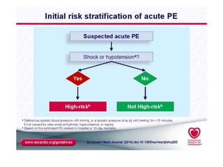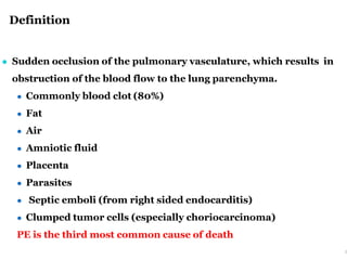 1. Pulmonary embolism is a sudden blockage in the pulmonary arteries usually caused by blood clots.