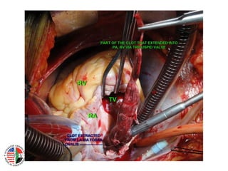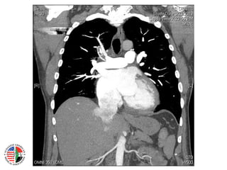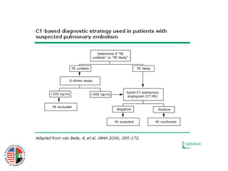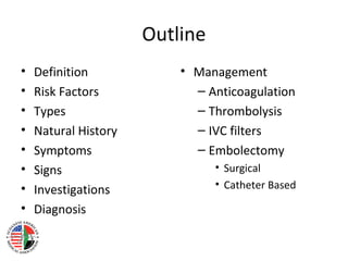 This document provides an overview of pulmonary embolism (PE), including its definition, risk factors, types, natural history, symptoms, signs, investigations, diagnosis, and management. PE is defined as obstruction of the pulmonary artery or its branches by material such as thrombus. It discusses diagnostic tests like CT, VQ scan, echocardiogram and their role in determining pretest probability. Management involves anticoagulation with drugs like heparin, warfarin, rivaroxaban. Thrombolysis may be used for massive PE while inferior vena cava filters can be placed in patients who cannot receive anticoagulation.