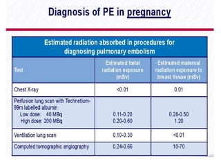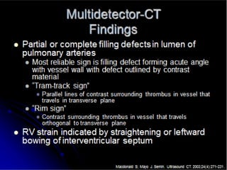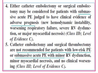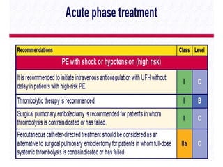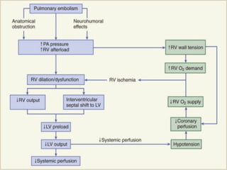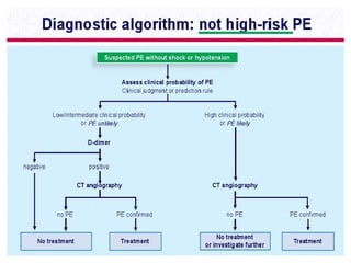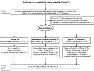 This document provides a comprehensive overview of pulmonary embolism (PE), outlining its origins, risk factors, clinical presentations, diagnosis, and treatment options. It highlights the significance of timely intervention in managing various types of PE, including massive and submassive embolisms, and discusses the role of anticoagulants and thrombolytics in treatment. Additionally, it covers diagnostic tools such as imaging techniques and risk stratification methodologies to assess and manage patients effectively.