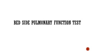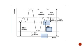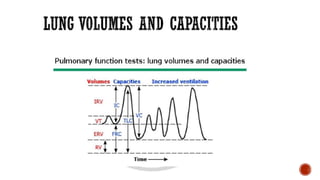 This document provides guidelines for ordering preoperative pulmonary function tests and describes various tests used to evaluate pulmonary function. It recommends ordering PFTs for patients over 70, obese patients, or those undergoing thoracic, upper abdominal, or lung surgery. Accepted PFTs include tests of static and dynamic lung volumes, diffusion capacity, and gas distribution. Bedside tests like breath-holding, forced expiratory time, peak flow, and pulse oximetry can also provide useful information. PFT tracings show lung volumes and capacities, and factors that impact the functional residual capacity are described.