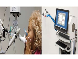 Pulmonary function tests (PFTs) measure how well the lungs work by assessing lung volumes, air flow, and gas exchange. PFTs can help diagnose various respiratory diseases by detecting abnormalities. The tests involve spirometry to measure volumes of air inhaled and exhaled during normal and forced breathing maneuvers. Obstructive diseases reduce air flow, shown by a decreased FEV1 and FEV1/FVC ratio. Restrictive diseases limit lung expansion, shown by a reduced FVC but normal or increased FEV1/FVC ratio. PFTs are useful for evaluating respiratory function and monitoring treatment effects.