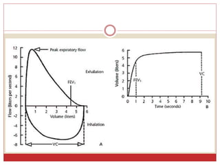 This document provides information on pulmonary function tests (PFTs). It discusses the goals of PFTs which include predicting and assessing pulmonary dysfunction. It outlines various lung volumes and capacities that can be measured through PFTs such as tidal volume, vital capacity, and total lung capacity. The document also discusses indications for preoperative PFTs and provides guidelines from different organizations. It summarizes different PFT measurements and their clinical significance. Overall, the document serves as a guide for understanding PFTs and their role in evaluating pulmonary function and perioperative risk.
