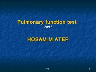 The document discusses pulmonary function tests (PFTs), which measure lung function. PFTs include spirometry, lung volumes, gas transfer, and bronchial challenge tests. Spirometry measures airflow and lung volumes during forced expiration. It provides values like FVC, FEV1, and FEV1/FVC ratio. Flow-volume loops plot inspiratory and expiratory airflow against volume and help diagnose airway obstruction. Obstructive patterns include concave loops in asthma and dog-leg shapes in emphysema. PFTs can detect obstructive and restrictive lung diseases and monitor response to treatment.