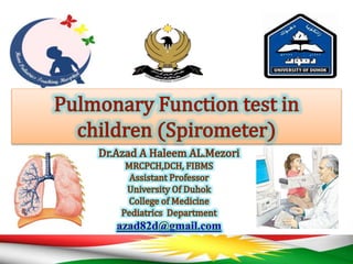 Spirometry is a noninvasive pulmonary function test that measures lung volumes and airflow. It is useful for diagnosing and monitoring respiratory diseases like asthma in children who are able to perform the test properly. Key measurements include forced vital capacity (FVC), forced expiratory volume in 1 second (FEV1), and ratios like FEV1/FVC. Obstructive patterns show reduced airflow while restrictive patterns show reduced lung volumes. Spirometry provides objective data to guide treatment and monitor response to medications like bronchodilators.