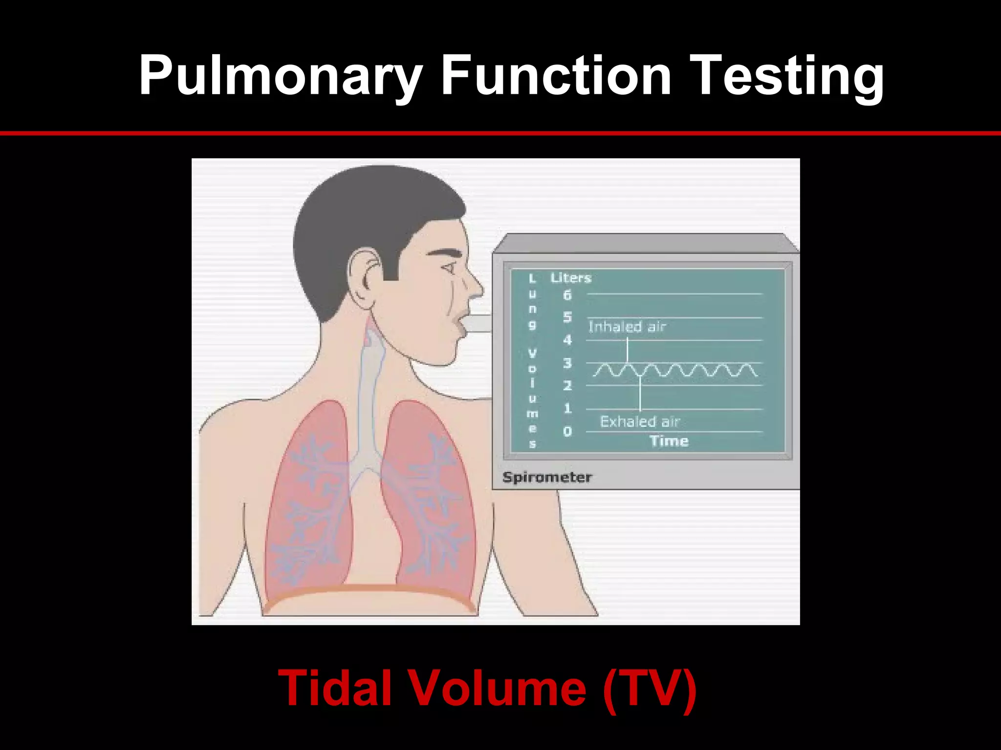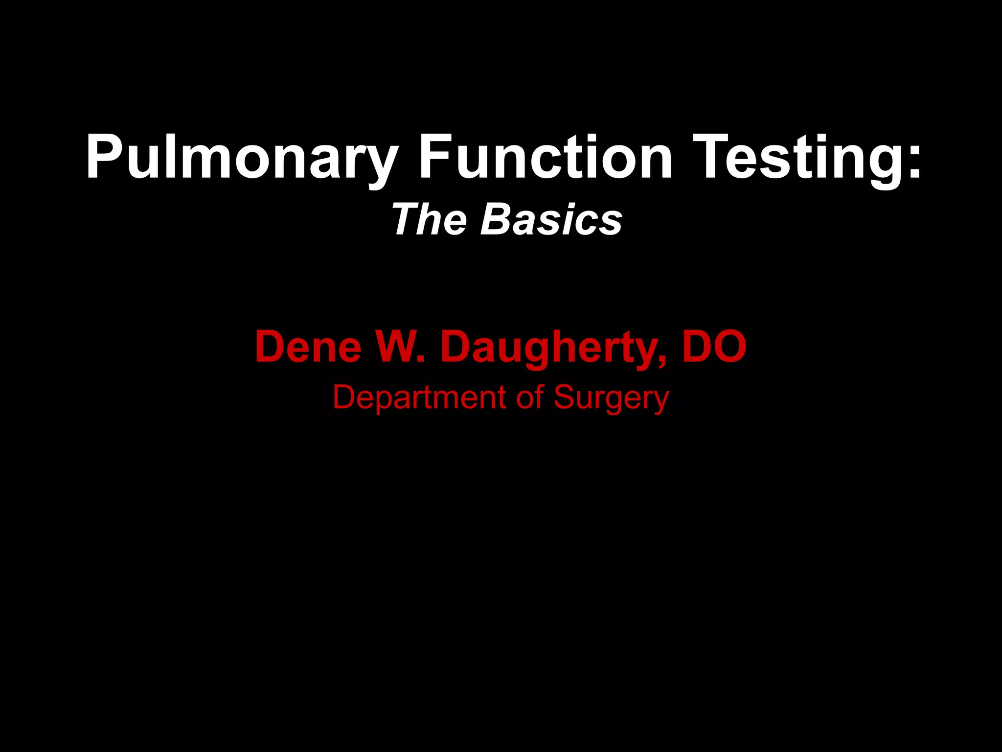This document provides an overview of pulmonary function testing (PFT), including the components measured, indications for testing, interpretation of results, and clinical applications. It describes common PFT measurements like spirometry, lung volumes, diffusing capacity, and bronchoprovocation testing. Obstructive and restrictive patterns are discussed. The document also reviews indications for PFTs in diagnosis and prognosis of lung diseases and provides examples of PFT patterns in conditions like asthma, COPD, and interstitial lung disease.