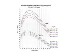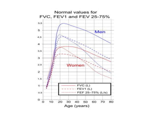 Pulmonary function tests evaluate lung function through measurements of lung volumes, capacities, flows, and gas exchange. Spirometry is the most common pulmonary function test and measures volumes of air inhaled and exhaled over time through the use of a spirometer. Key spirometry metrics include forced vital capacity, forced expiratory volume in 1 second, and peak expiratory flow rate. Arterial blood gases analyze blood pH, oxygen, and carbon dioxide levels to assess lung function and respiratory disease. Together, pulmonary function tests provide diagnostic and monitoring tools for conditions like asthma, COPD, and lung impairments.