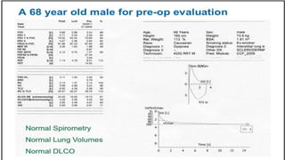 Dr. M.MADHU CHAITANYA presented on pulmonary function tests. PFTs are a battery of standardized tests used to evaluate aspects of the respiratory system, including lung mechanics, gas exchange, and cardiopulmonary interaction. Common PFTs include spirometry to measure volumes like FVC and rates like FEV1, lung volume measurements via body plethysmography or other methods, and gas exchange tests. PFTs are used to diagnose and monitor respiratory conditions, and to evaluate patients preoperatively by assessing cardiopulmonary reserve and risk of complications. The presentation covered techniques, normal values, and clinical applications of various PFTs.