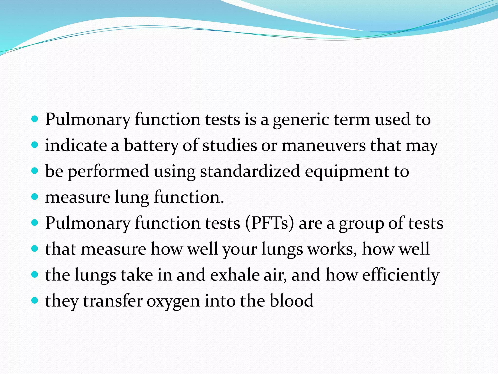 The document discusses pulmonary function tests (PFTs) designed to measure and evaluate lung function, including how well they take in and exhale air and transfer oxygen into the blood. It covers various aspects of PFTs such as spirometry, lung volumes and capacities, and diagnostic applications for respiratory conditions. The text illustrates how PFTs help distinguish between obstructive and restrictive lung problems and highlights important measurement values and their interpretations.