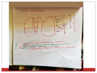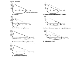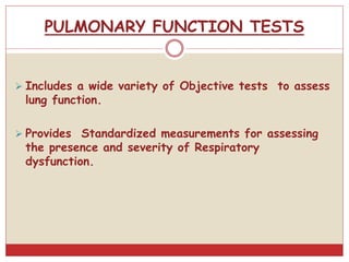 This document provides information on pulmonary function tests (PFTs). It discusses the goals of PFTs which include predicting and assessing pulmonary dysfunction. Various lung volumes, capacities, and flow rates are defined, including forced vital capacity (FVC) and forced expiratory volume in 1 second (FEV1). The document outlines indications for preoperative PFTs and categorizes different types of PFTs including mechanical ventilatory tests, gas exchange tests, and tests of cardiopulmonary interaction. Bedside PFTs such as breath-holding tests and cough tests are also summarized.
