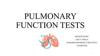 Pulmonary function tests (PFTs) are critical evaluations used to assess respiratory health by measuring lung volume, capacity, flow rate, and gas exchange, aiding in diagnosing obstructive and restrictive lung diseases. Tests like spirometry and diffusing capacity for carbon monoxide (DLCO) help determine the severity of conditions such as asthma, COPD, and pulmonary fibrosis. The document outlines various lung volumes, capacities, and specific tests, detailing their procedures and interpretation in clinical practice.