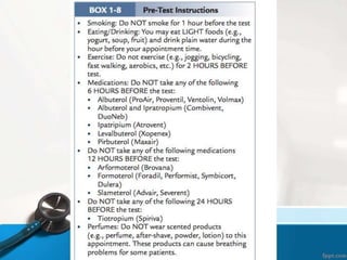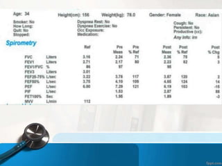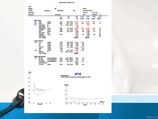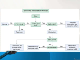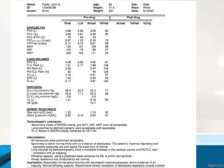 This document discusses pulmonary function tests and spirometry. It explains that pulmonary function tests can measure spirometry, bronchoprovocation, exercise capacity, lung volumes, diffusion capacity, and more. Prediction of normal data is based on height, age, gender, and race. The document also provides three case studies and notes that interpretation of pulmonary function test results requires a properly performed, accurate, and reproducible test along with a review of patient history and therapist notes.