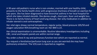 This patient, a 30-year-old woman, presented with progressive shortness of breath on exertion for two years. Tests revealed her pulmonary artery pressure was elevated at 55 mm Hg. Right heart catheterization confirmed a diagnosis of pulmonary arterial hypertension, showing a mean pulmonary artery pressure of 66 mm Hg and pulmonary vascular resistance of 15 wood units. As treatment for this non-vasoreactive pulmonary arterial hypertension, she will begin oral combination therapy based on her intermediate risk status.