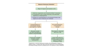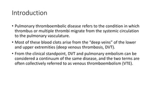 This document discusses pulmonary thromboembolism (PE), which refers to blood clots (thrombi) traveling from deep veins to the lungs. Most clots originate in the lower extremities. Risk factors include inherited conditions, surgery, trauma, immobilization, cancer and pregnancy. PE can cause hypoxemia and pulmonary hypertension. Diagnosis involves clinical assessment, D-dimer testing, chest imaging like CT pulmonary angiogram (gold standard), ventilation-perfusion scanning and echocardiogram. Treatment aims to relieve symptoms and prevent complications like right heart strain.
