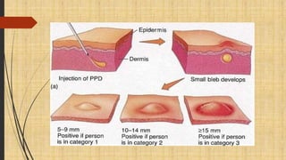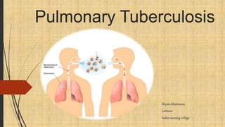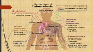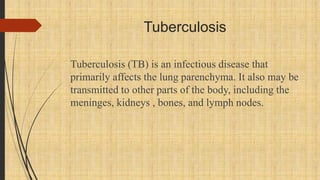 Tuberculosis is an infectious disease primarily affecting the lung parenchyma caused by Mycobacterium tuberculosis. Risk factors include age, immune status, living conditions, and country of origin. It spreads through airborne droplets from coughing, sneezing, etc. Symptoms may include cough, fever, weight loss, and night sweats. Diagnosis involves chest x-ray, sputum smear, tuberculin skin test, and culture. Treatment involves a combination of antibiotic medications over several months. Patient education focuses on medication compliance, prevention of spread, signs of treatment failure, and lifestyle modifications.