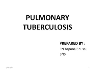 This document provides an overview of pulmonary tuberculosis, including its definition, classification, types, incidence, risk factors, pathophysiology, signs and symptoms, diagnosis, treatment, nursing management, and complications. It classifies TB based on anatomical site, previous treatment history, and drug resistance. Key points include that TB is caused by the bacterium Mycobacterium tuberculosis and spreads through airborne droplets. Diagnosis involves chest x-rays, sputum smears and cultures, tuberculin skin tests, and interferon-gamma blood tests.
