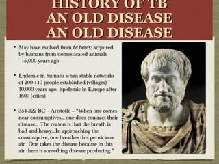 Pulmonary tuberculosis (TB) is an ancient disease caused primarily by Mycobacterium tuberculosis, with evidence of its presence dating back to Neolithic times. It remains a leading cause of death globally, with an estimated 1.86 billion people currently infected, and approximately 2 million deaths annually due to TB. The spread of TB occurs mainly through respiratory droplets, and its transmission is exacerbated by factors such as overcrowding and poor hygiene.