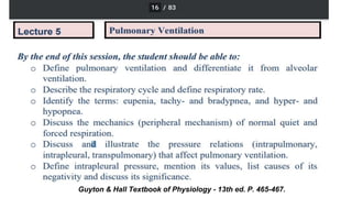 Pulmonary ventilation is the mechanical process of air flowing in and out of the lungs due to pressure gradients and volume changes caused by contraction of respiratory muscles during inspiration and expiration. It serves to continually renew the air in the gas exchange areas of the lungs. In a healthy adult, pulmonary ventilation is approximately 6-7 liters per minute through tidal breathing of 500ml 12 times per minute, resulting in alveolar ventilation of around 4200ml per minute after accounting for the 150ml dead space. Pulmonary ventilation, alveolar ventilation, respiratory cycles, and the mechanics of respiration including respiratory muscles, pleural pressures, and pressure relationships are discussed in detail.