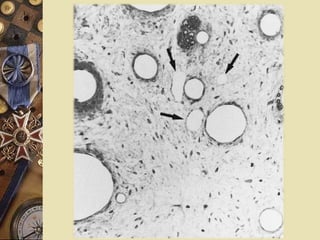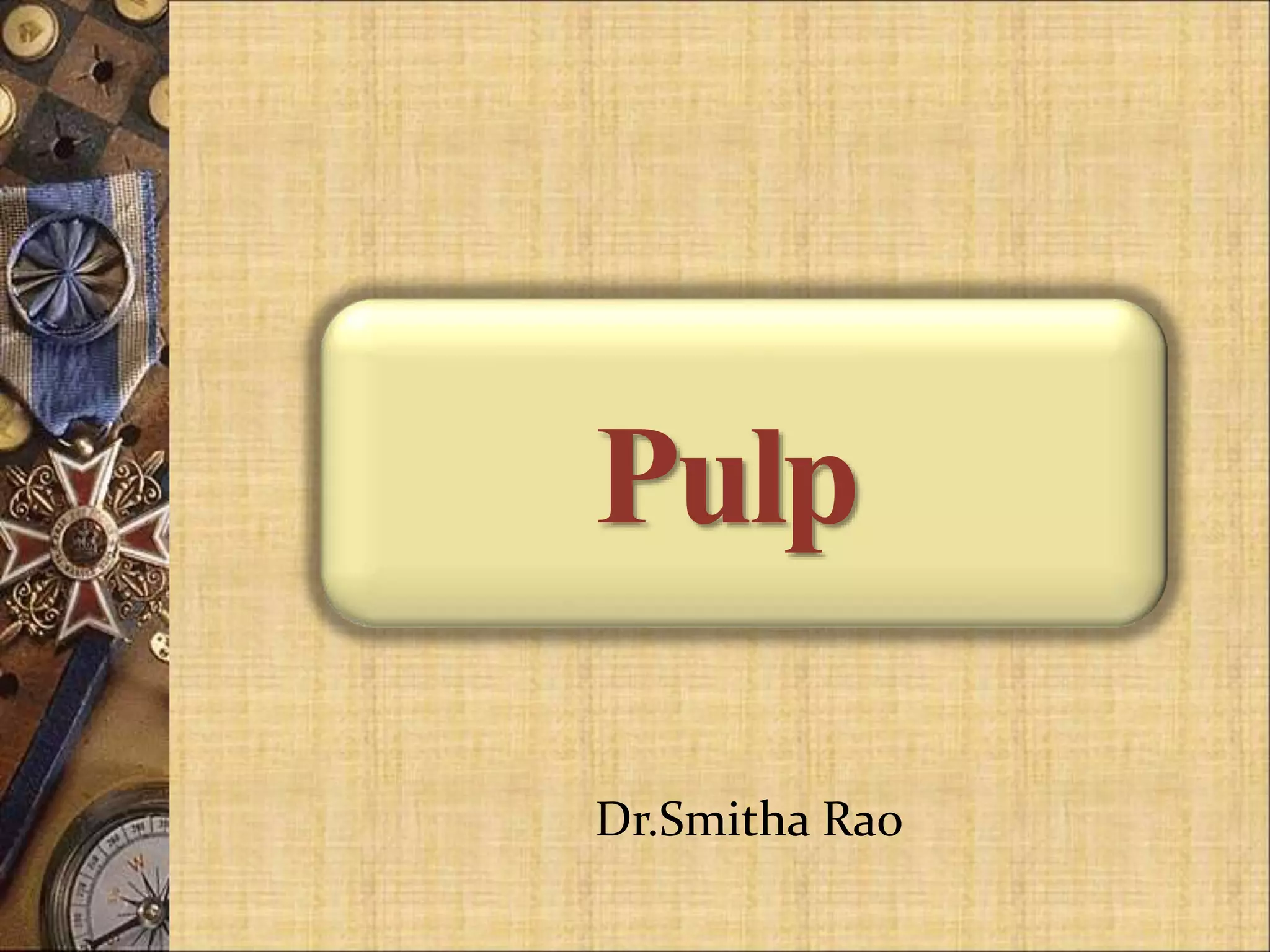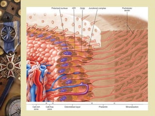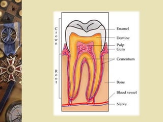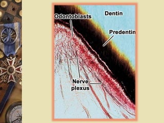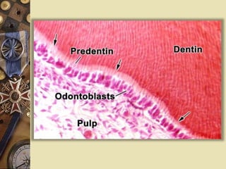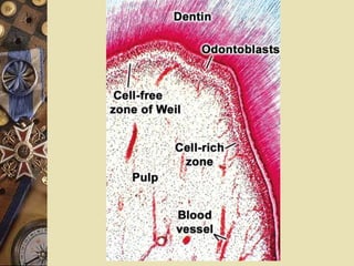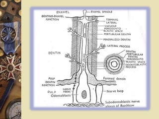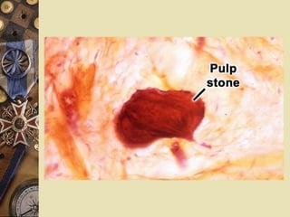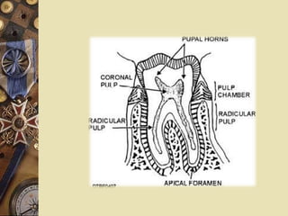 The dental pulp is the soft tissue contained within the pulp chamber and root canals of teeth. It is composed of loose connective tissue and nerves that provide sensation and nourishment to the tooth. The pulp contains cells such as odontoblasts, fibroblasts, macrophages, and stem cells embedded within an extracellular matrix. Odontoblasts are responsible for dentin formation and maintenance. With age, the pulp undergoes regressive changes like fibrosis, calcification in the form of pulp stones, and decreased cellularity. Diseases like caries, trauma, and chemical irritation can lead to inflammation of the pulp tissue.