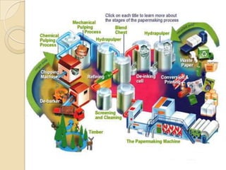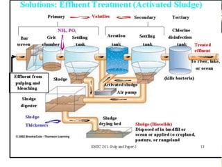 Pulp and paper mills produce large amounts of liquid and solid waste from their pulping and papermaking processes. Liquid waste is characterized by high levels of biochemical oxygen demand, suspended solids, and chemical oxygen demand. Solid waste includes treatment sludge and fly ash. Wastewater treatment involves neutralization, screening, sedimentation, and activated sludge or anaerobic fermentation to remove organic content. Sludge is dewatered and combusted. Alternative technologies also exist for sludge disposal and wastewater treatment.