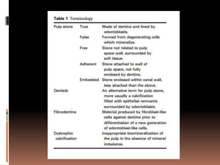This document discusses pulp calcification and pulp stones. It notes that pulp stones are a physiological manifestation that may increase in number or size due to local or systemic pathology. The etiological factors involved in their formation are not fully understood. As people age, the pulp space decreases in size and the blood vessels, nerves, and cells in the pulp also decrease. Pulp stones can form due to factors like age, circulatory disturbances, orthodontic tooth movement, and genetic predisposition. They are typically composed of calcium and phosphorus. Pulp stones may block access to canal orifices or engage instruments, but can usually be removed during root canal treatment with magnification, access, and proper instruments.