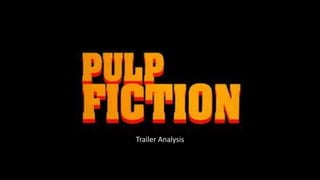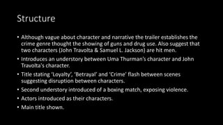 The trailer establishes the crime genre through scenes of guns and drug use, suggesting the main characters played by John Travolta and Samuel L. Jackson are hit men. It introduces a relationship between Travolta and Uma Thurman's character and flashes titles like "Loyalty" and "Betrayal" between scenes. It also shows a boxing match to expose violence. The editing cuts scenes quickly to match the fast-paced soundtrack and titles like "loyalty" flash on screen. When the main title displays, it flashes three times with gunshots. The soundtrack mimics the quick cuts initially and changes to suit different scenes and emotions.