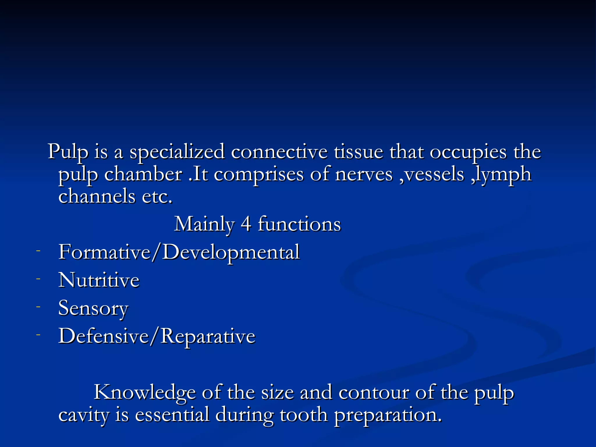 The document discusses pulp protection in dentistry. Pulp is connective tissue inside teeth that has nerve, blood vessel and lymph functions. Pulp can be irritated by microbes, chemicals, heat or radiation. To protect pulp, dentists use liners, bases, cavity varnishes and pulp capping or pulpotomy if exposed. Calcium hydroxide is commonly used as it encourages dentin formation and healing. Protecting pulp is important to prevent inflammation and infection that can damage teeth.