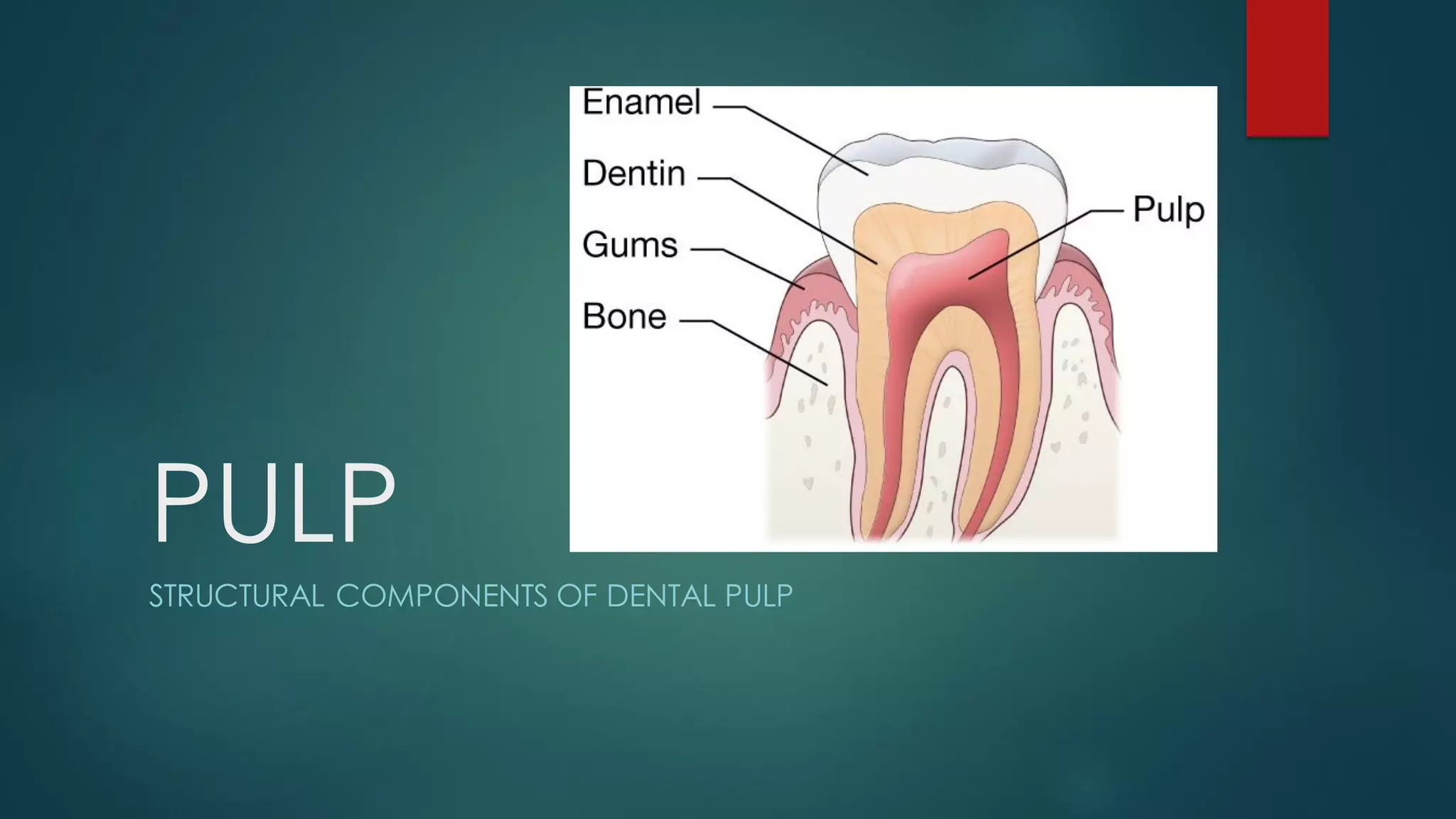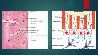 The document describes the structural components of dental pulp, detailing cellular elements such as odontoblasts, fibroblasts, undifferentiated mesenchymal cells, and immunocompetent cells, along with their functions. It discusses the extracellular components, including fibers, ground substance, blood vessels, lymphatic channels, and nerve supply, highlighting their roles and changes with age. The organization and functions of these components contribute to the integrity and health of dental pulp.