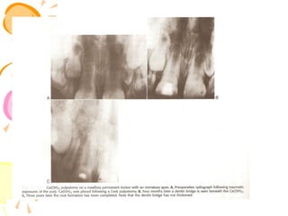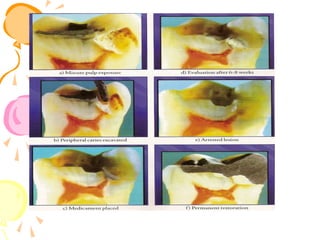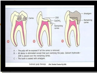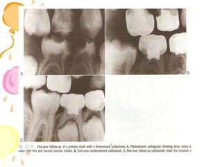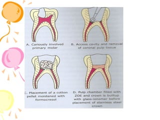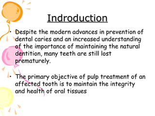 This document discusses pulp therapy in pediatric dentistry. It outlines several reasons for preserving teeth with pulp involvement, including preventing malocclusion, aiding mastication, and preventing psychological impacts of early tooth loss. The primary objectives of pulp treatment are to maintain oral health and integrity. A thorough diagnosis involves assessing factors like pain characteristics, tooth mobility, discoloration, periapical changes on radiographs, and pulpal hemorrhage in response to exposure. Pulp testing can help evaluate vitality, though results may be inconclusive for primary teeth. The goal of treatment is to restore the tooth when possible while considering the extent of pulpal inflammation or necrosis.
