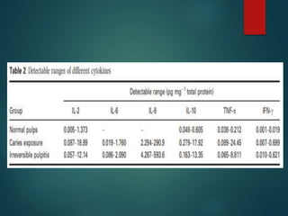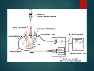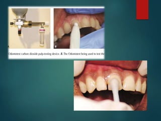 This document provides an overview of pulp sensitivity and vitality testing. It defines key terms like sensitivity, vitality, and outlines different types of pulp tests including thermal tests using heat or cold, electric pulp testing, anesthetic testing, and bite testing. The document discusses the neurophysiology of the pulp and ideal characteristics of pulp tests. It also covers uses of pulp testing and provides details on performing and interpreting various test results.