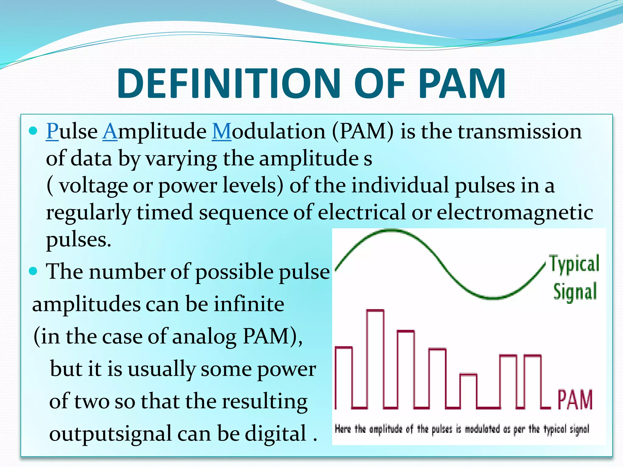 Pulse amplitude modulation (PAM) is a modulation technique where the amplitude of pulses in a regularly timed sequence is varied according to the amplitude of the modulating signal. There are two types of PAM: single polarity PAM which adds a DC bias to ensure all pulses are positive, and double polarity PAM where pulses can be both positive and negative. PAM is generated by sampling the modulating signal at regular intervals and making each sample proportional to the amplitude of the modulating signal at the time of sampling. The amplitude of the PAM signal then carries the information contained in the modulating signal.
