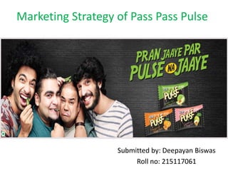 Pass Pass Pulse is a candy launched by the Dharampal Satyapal Group, a multibillion-dollar conglomerate. The Indian confectionery market is large, with hard boiled candies making up 48% and flavors like mango claiming 50% share. Pass Pass Pulse differentiates itself with its unique kachha aam and raw mango flavor. Its marketing strategy involves extensive flavor research, attractive packaging, and availability everywhere. It targets all age groups across India with a mass market strategy and pioneered a category shift from impulse to brand-driven buying. Word-of-mouth on social media was a major factor in its promotion, with consumers actively promoting the brand online.